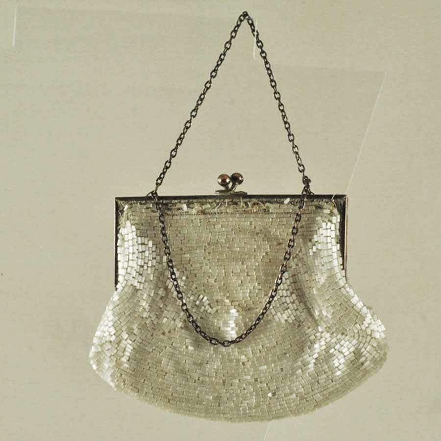 Petit sac de soirée 1900 perlé blanc nacré, monture et chaine en métal=manque de perles le long du fermoir-