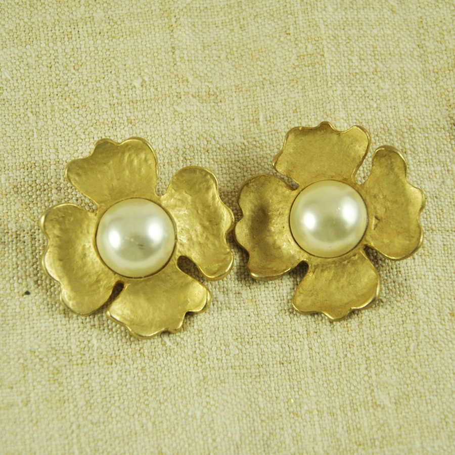Spectaculaires boucles d’oreilles ( clips ) ca 1980 signées David Grosse en laiton doré et grosse perle fantaisie nacrée, en bon état.