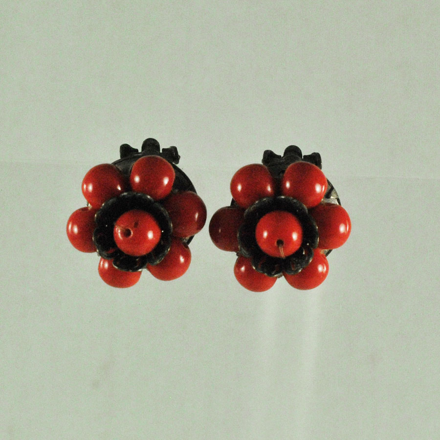 Clips d’oreilles 1950, perles en verre rouge et laiton