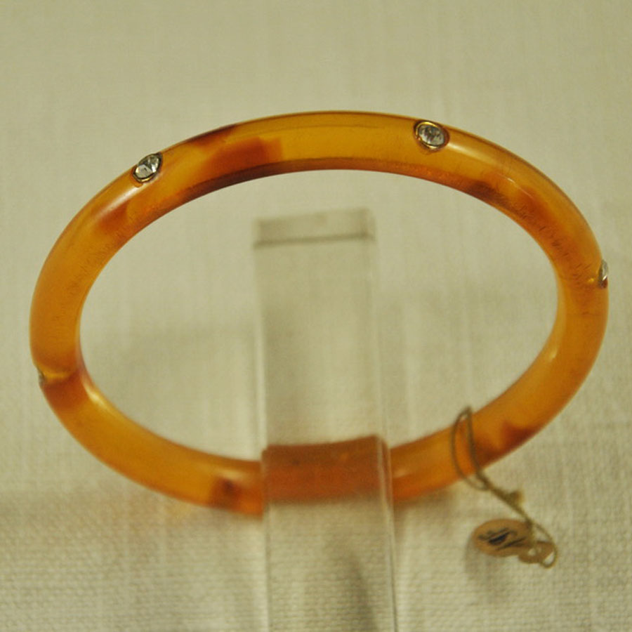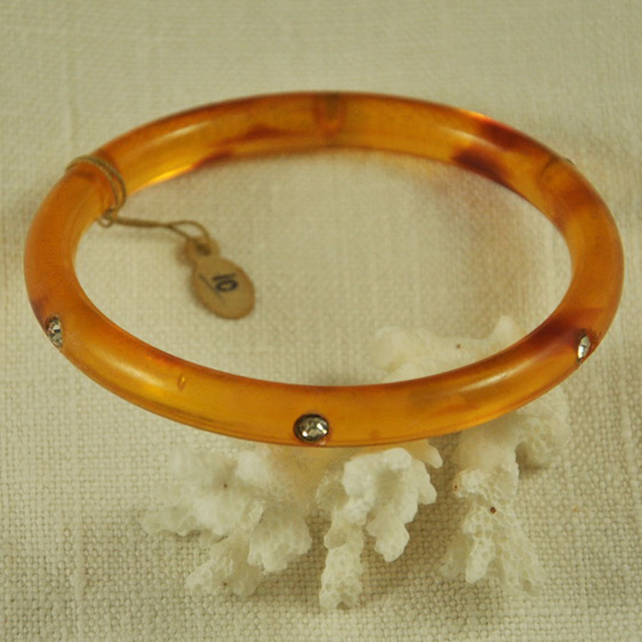 Jonc 1960 en acétate translucide ambre pavé de strass en bon état, jamais porté.