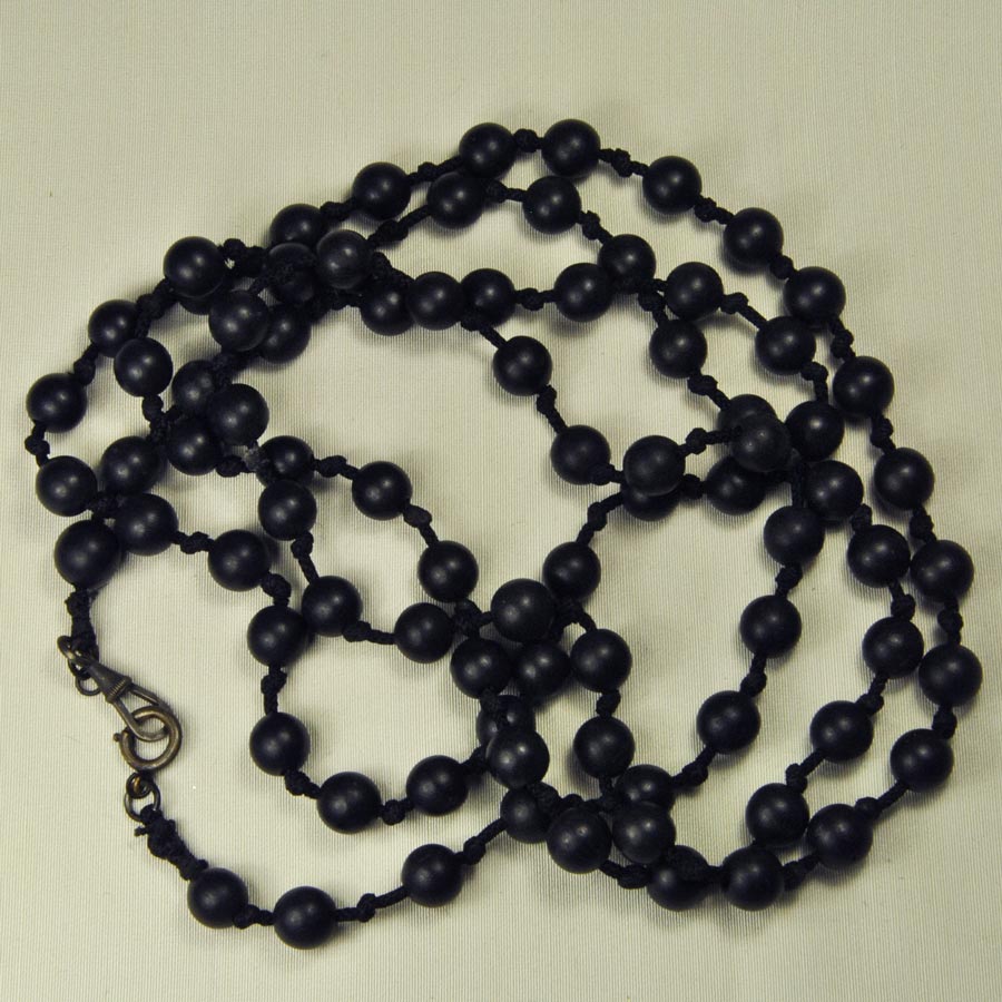 L.: 85 cmGrand sautoir Napoléon III en grosses perles en buis noirci montées sur coton et séparées par des nœuds, mousqueton en métal pour accrocher des ciseaux.