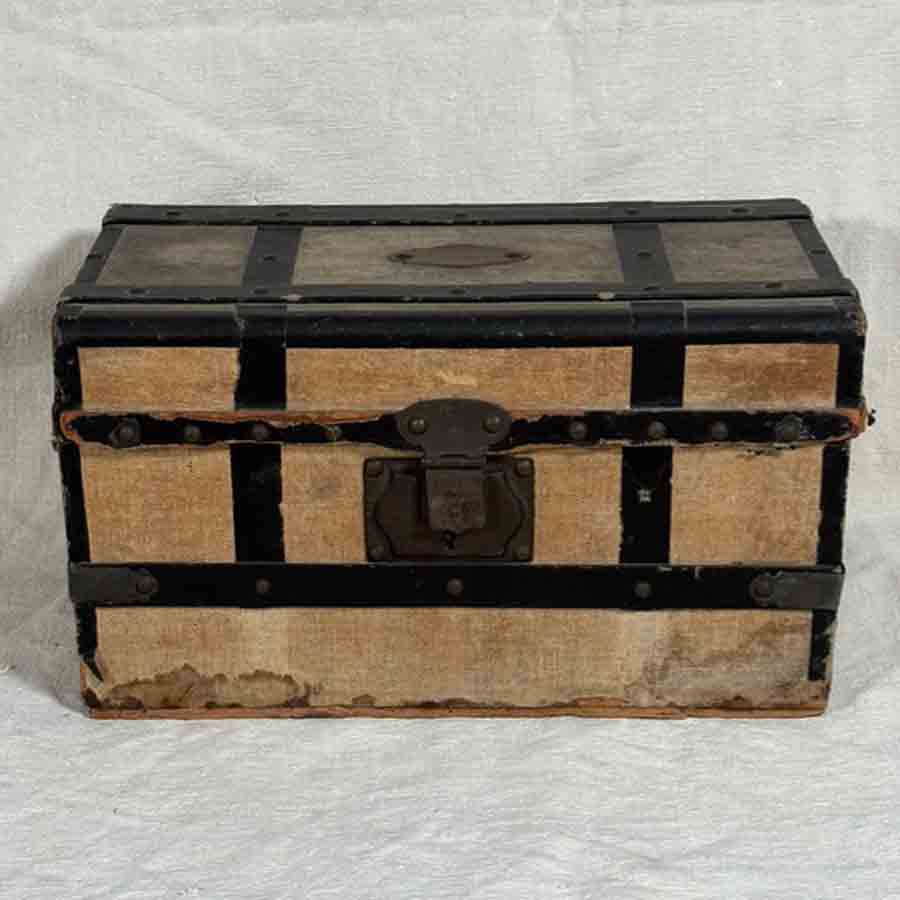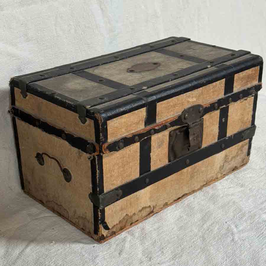 Charmant Coffret XIXème en bois reouvert de papier gommé vieux rose, médaillon floral chromolithographié sur le couvercle, en bon état.