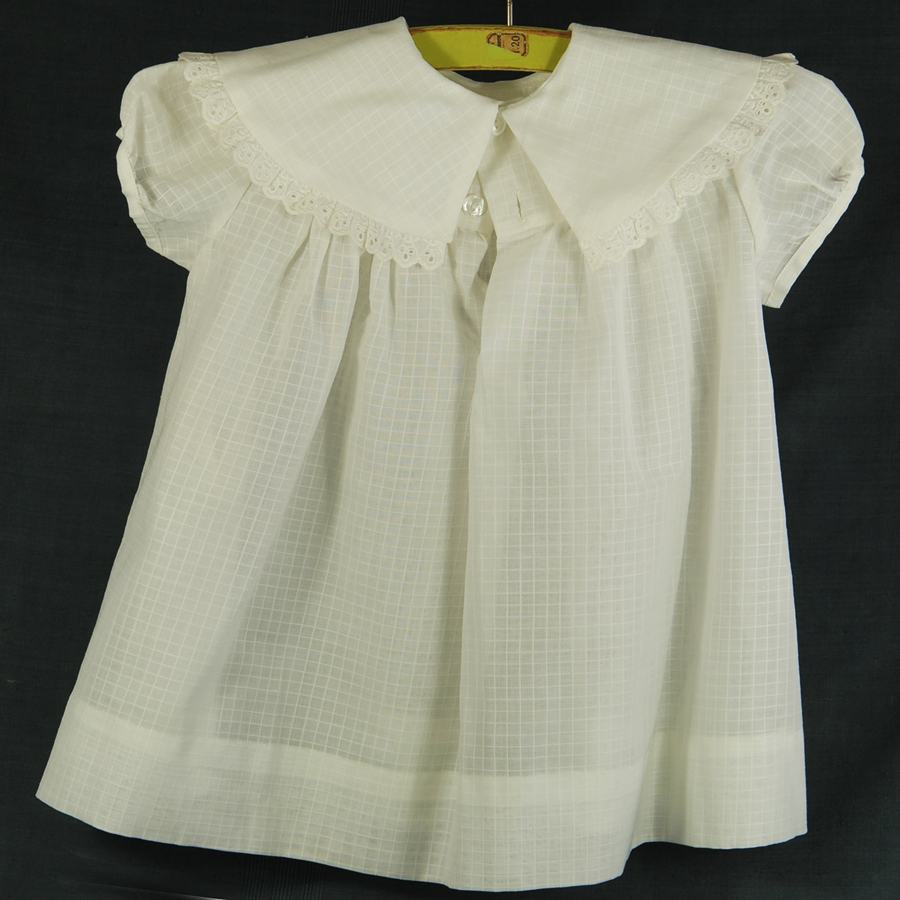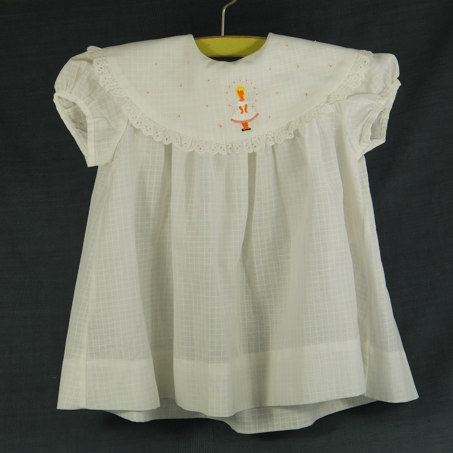 Très jolie robe de fillette en coton fin blanc quadrillé; guimpe bordée de broderie anglaise et rebrodé de fleurettes et d’une petite fille.Manches ballon. Fermée par 2 boutons. Marque « CARABI » T.: 40