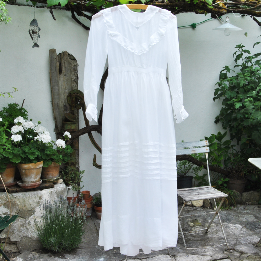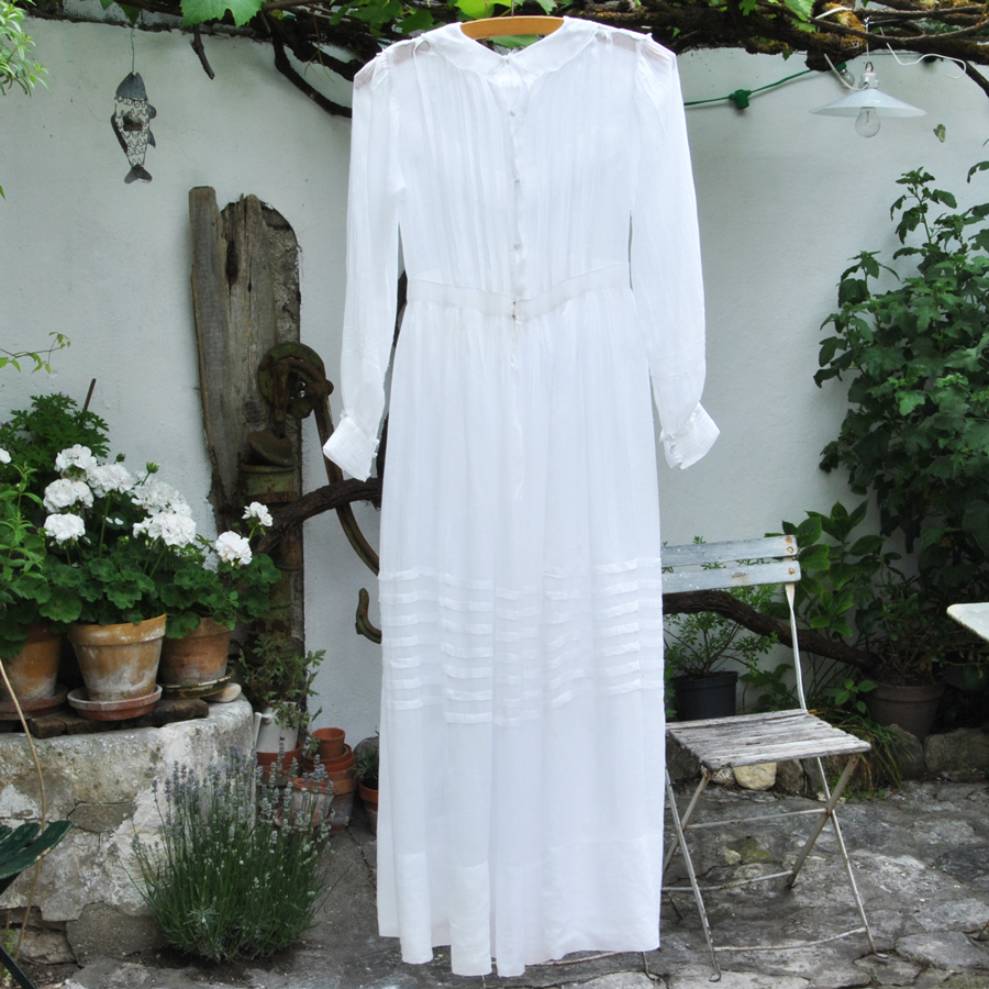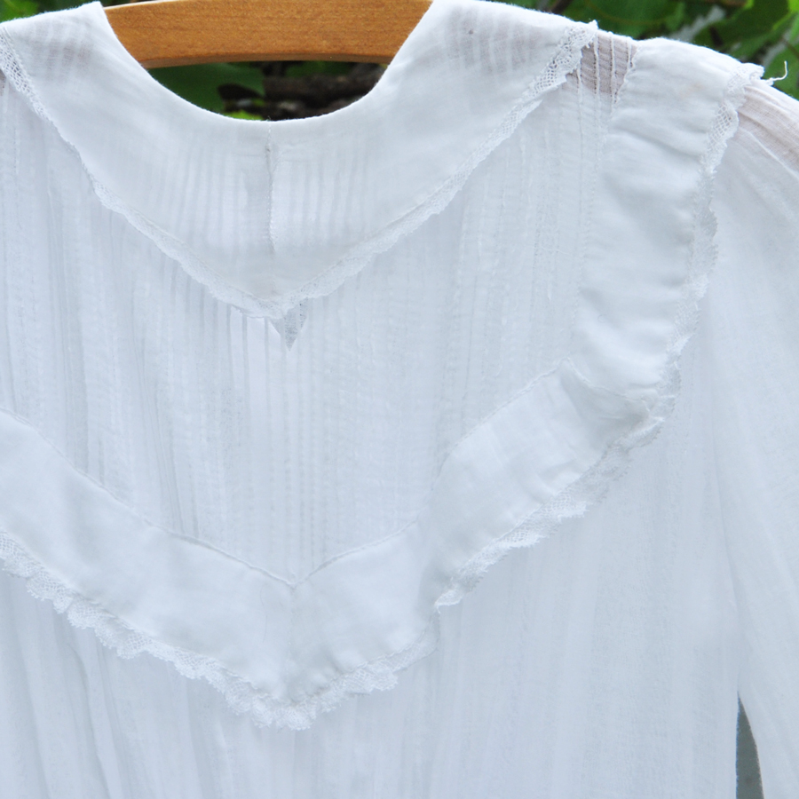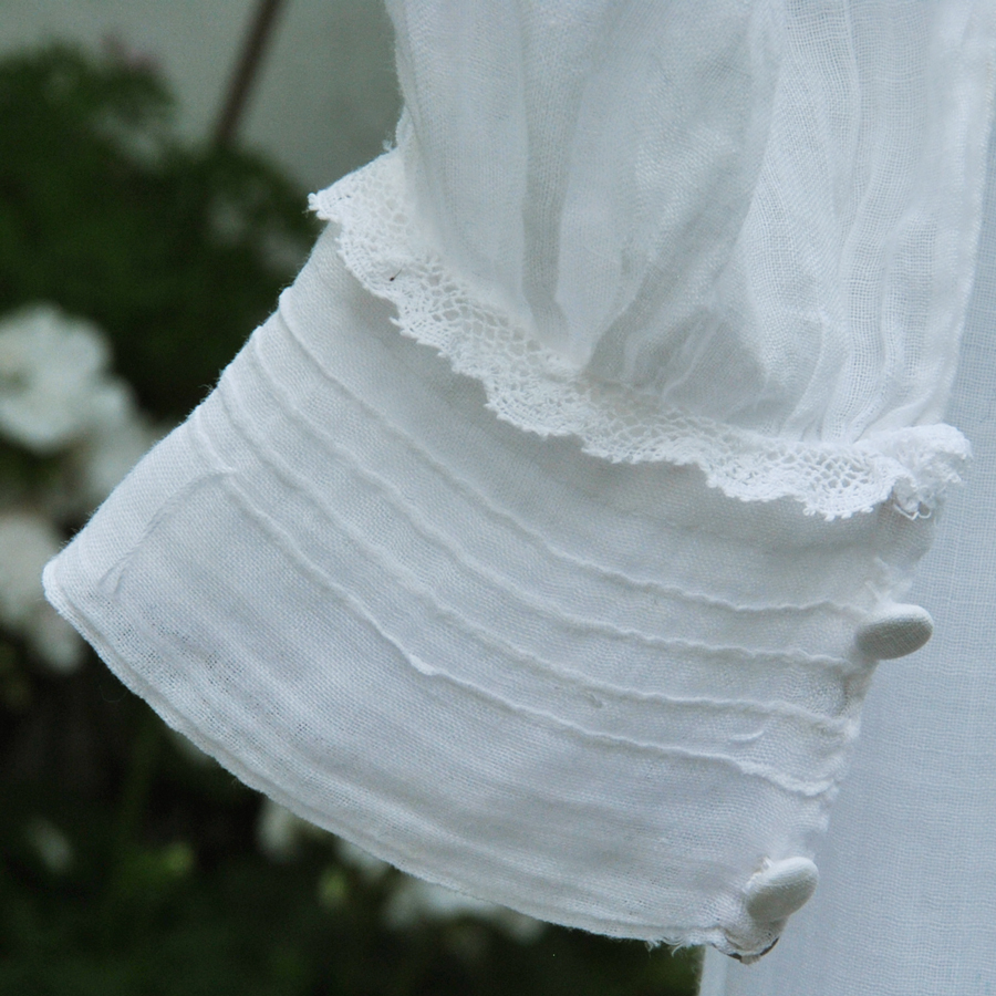 Délicate robe de communiante 190 en linon blanc très fin, plastron finement plissé, volant brodé de dentelle, poignets renversés, plis religieuses.-2 petits accros dans le dos.