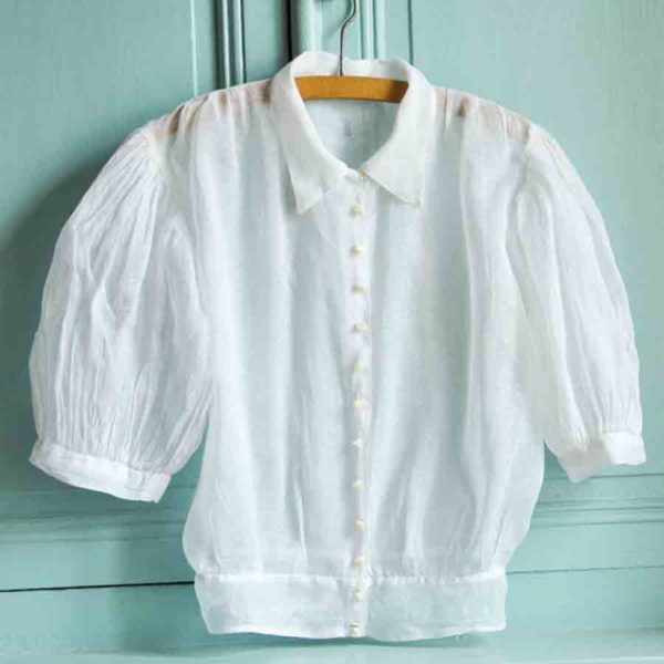 Très joli corsage ca 1920 en organdi de fin coton blanc transparent, motifs floraux et animalier, manches ballon, resserré à la taille par une bande, 12 boutons en nacre, entièrement fait à la main, en bon état.