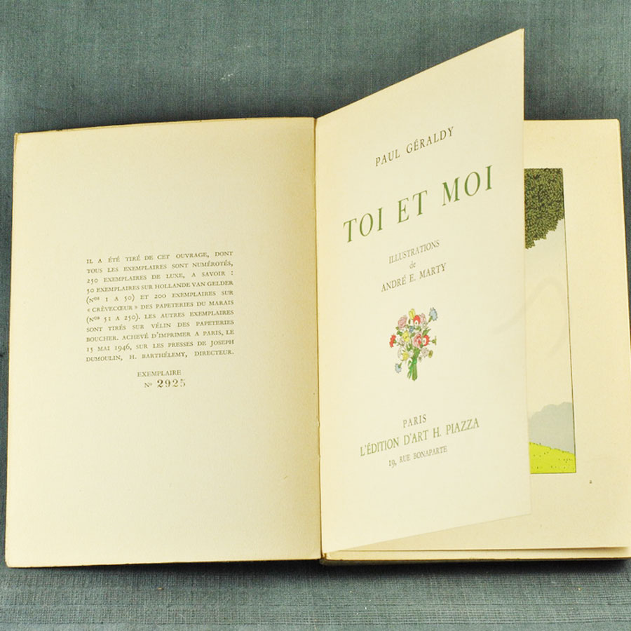 « TOI Et Moi » de P. Geraldy, joli ouvrage numéroté, illustrations d’André E. Marty. Edition d’Art Piazza Paris 19 rue Bonaparte 150 p. en bon état.