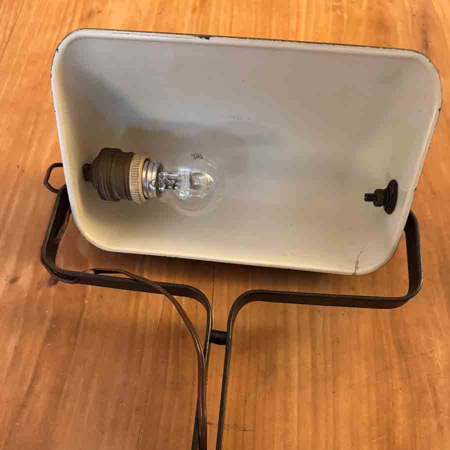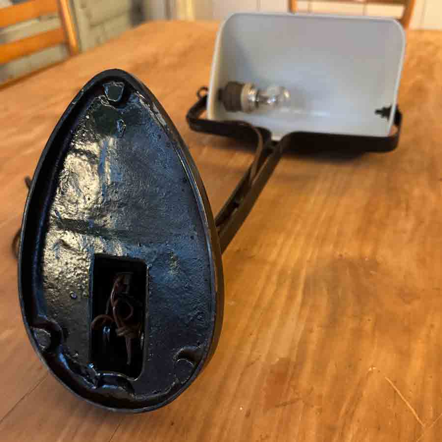 Lampe de bureau 1930, pied en fonte émaillé noir, bras en fer et réflecteur en bakélite noir et blanc avec une petite fissure sans gravité, douille à vis