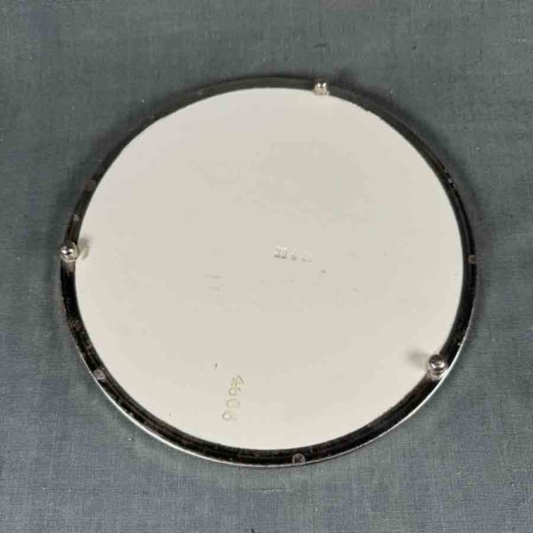 Dessous de plat en faïence blanche cerclé de laiton chromé, 3 petits pieds, décor florale polychrome ca 1930 ø: 205 mm