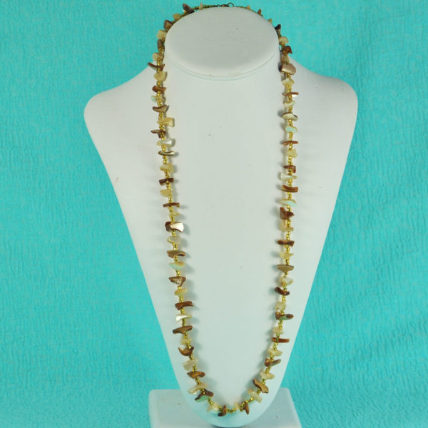 Sautoir 1960 , perles décroissantes en nacre naturelle et marron glacè séparées par des mini-perles en verre doré. L.: 76 cm