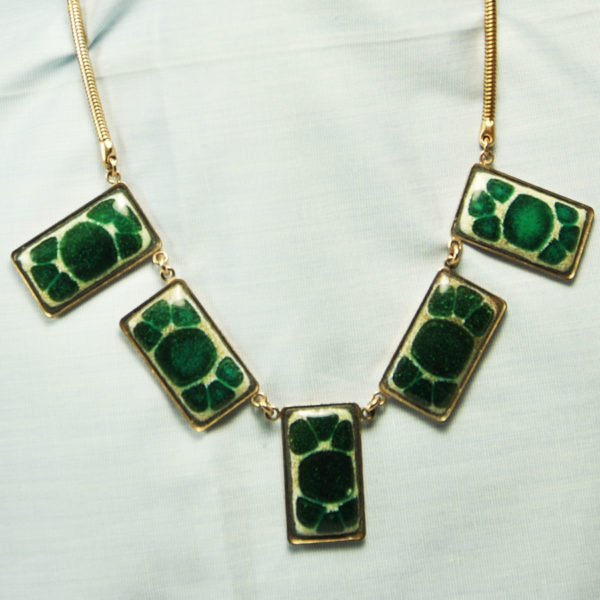 Joli collier 1950 ( costume jewelery USA), éléments vert vif , blanc gris, monture et chaine en métal cuivré, en excellent état, belle qualité. L.: 465 mm