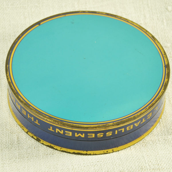 Boite en fer lithographiée, ca 1930 bleu et or « Sucre d’orge Vichy Etat » « Compagnie fermière de l’établissement thermal de Vichy » Diam.: 192 mm H.: 33 mm