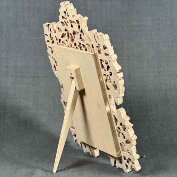 Porte-photo 1920 en bois sculpté et peint en ivoire et sa photo d’époque, en bon état. H.: 265 L.: 180 mm