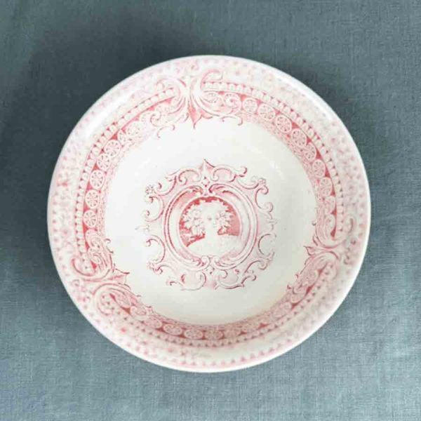 Belle petite cuvette XIXème en faïence ivoire de Sarreguemines, décor « Parisia »rouge clair en bon état. H.: 50 mm ø: 154 mm