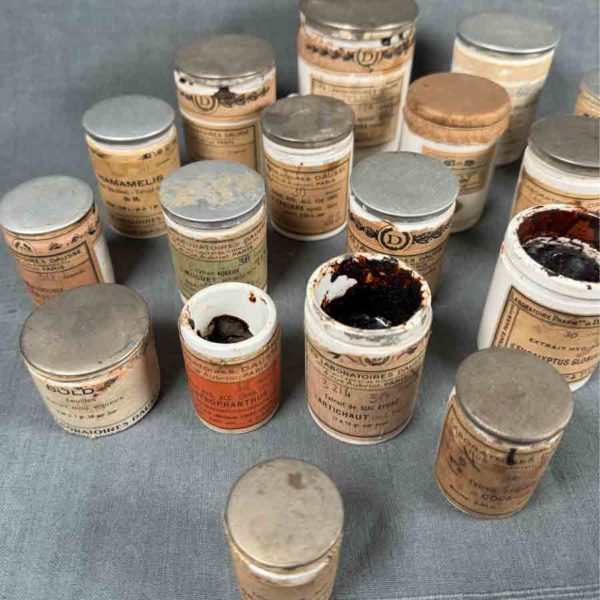 19 petits pot à onguent 1930 en faïence blanche encore remplis avec leurs étiquettes H.: 40 – 80 mm ø: 28 – 57 mm