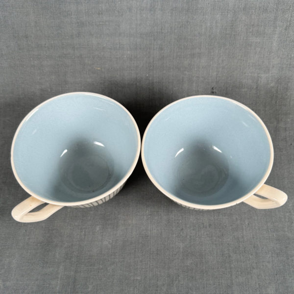 2 belles tasses ca 1940 en faïence ivoire de Villeroy et Boch, modèle « Béatrice » made in Germany, bleu ciel et quadrillées noir, en bon état. H.: 63 mm ø: 106 mm