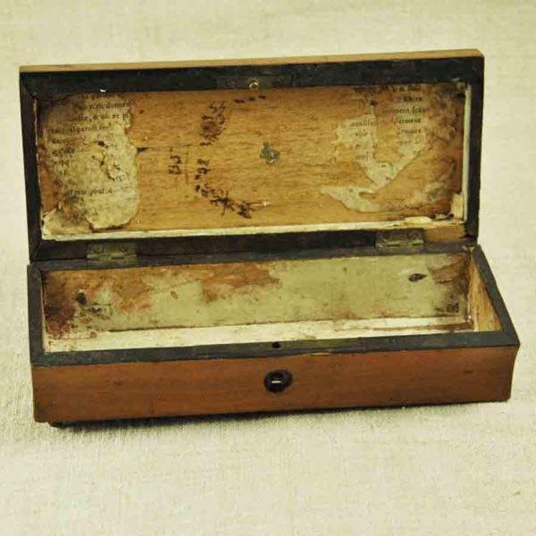 Joli plumier Charles X en bois fruitier décoré de clous en fer, en bon état. 185 x 81 mm H.: 50 mm