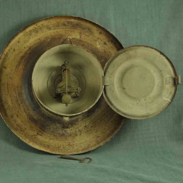 Charmante pendule murale ca 1900 en tôle peinte patinée, décorée de petits sujets enfantins, en état de marche et sa clef, en bon état. ø; 320 mm