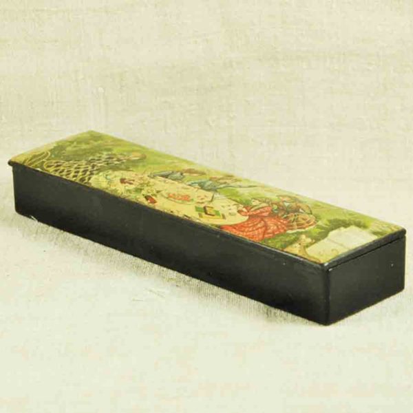 Très charmant plumier 1900 en papier mâché noir, décor lithographié polychrome: « Exercice de peinture », en bon état. H.: 25 mm 180 x 57 mm