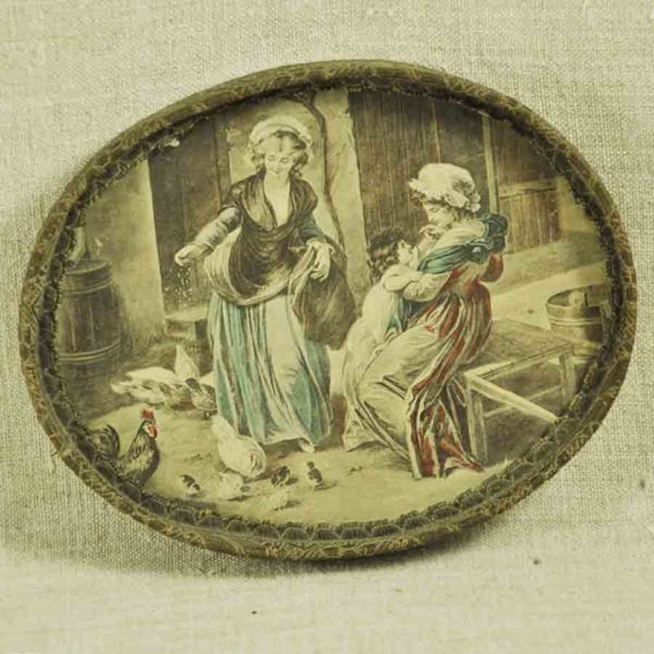 Charmant petit plateau 1900 en carton lithographié, scène rurale, en bon état. 170 x 135 mm