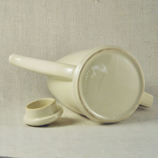 Cafetière isotherme ca 1970 en faïence blanche et sa coque en aluminium martelé, en bon état. H.: 245 mm ø: 140 mm