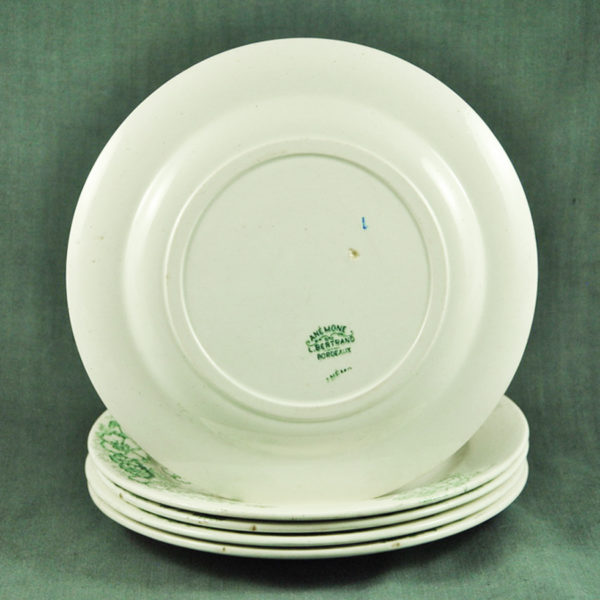 5 assiettes 1900 en faïence blanche de Bordeaux (L. Bertrand) décor « Anémones »vert pale, en bon état. ø: 228 mm