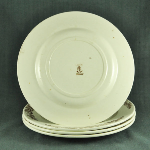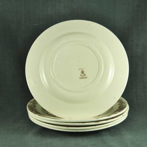 4 assiettes plates XIXème en faïence ivoire de St Clément, décor romantique sépia, en bon état. ø: 239 mm