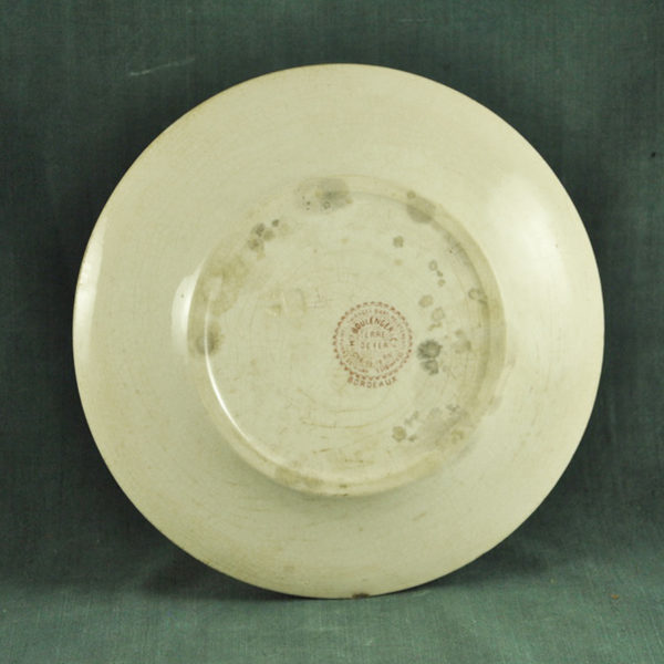 Jolie assiette plate XIXème en faïence ivoire de Choisy le roi décor floral rose foncé, tachée à l’envers, en bon état. ø: 213 mm