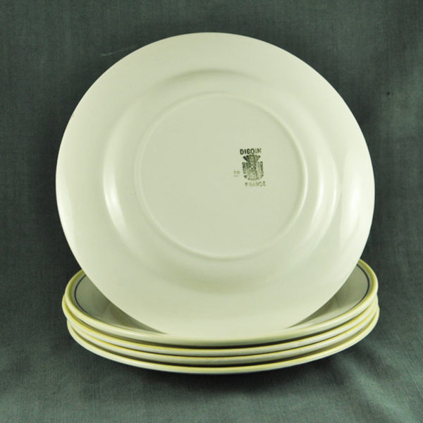 5 assiettes plates ca 1950 en faïence blanche de Digoin Sarreguemines, décor feuilles de vignes jaune et noir, en bon état. ø: 225 mm