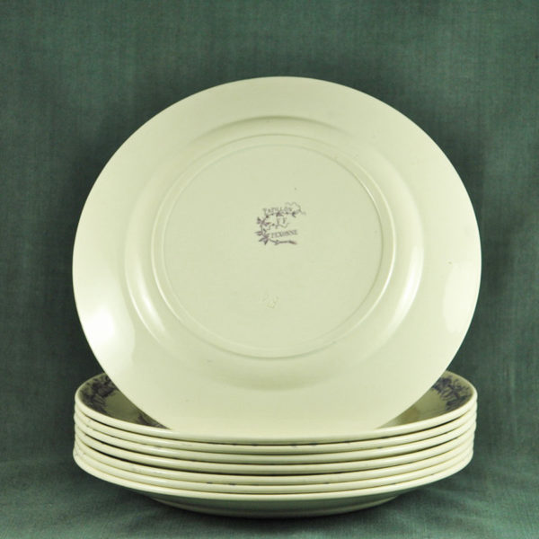8 assiettes plates XIXème en faïence blanche de Pexonne,décor « Papillon » mauve, en bon état. ø: 220 mm