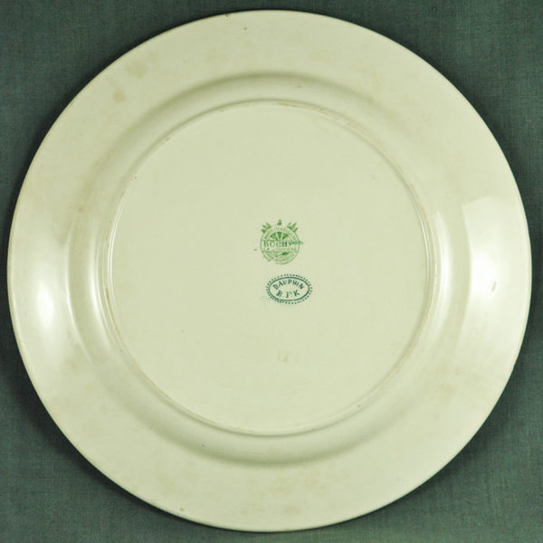 Plat rond 1900 en faïence ivoire de Boch Frères, décor « Dauphin » floral bleu/vert, en bon état.-vendus à la pièce- ø: 278 mm