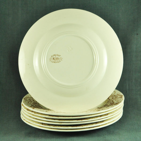 7 assiettes à dessert en faïence blanche de XIXème Lunéville (K&G), décor « Surcuf » romantique sépia, en bon état. ø: 204 mm