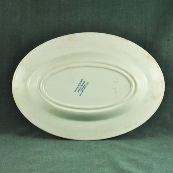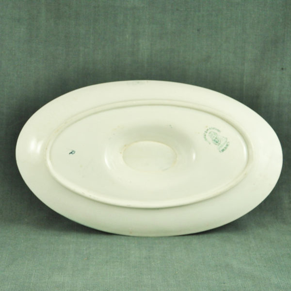 Plat ovale 1900 en faïence blanche de Boch Frères Kéramis, décor « Grand bouquet » floral bleu indigo, en bon état. 257 x 182 mm
