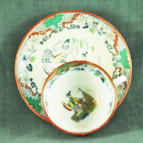 Jolie tasse XIXème et sa soucoupe en faïence blanche de Sarreguemines, décor « Timor » japonisant polychrome en bon état. H.: 53 mm ø: 146/91 mm