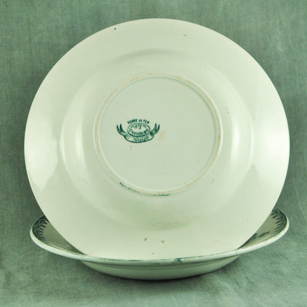 2 assiettes creuses 1900 en faïence blanche de St Amand, décor « Margot » floral vert, en bon état. ø: 225 mm