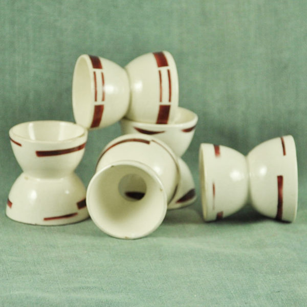 5 coquetiers « diabolo » ca 1930 en faïence ivoire décor géométrique rouge foncé, en bon état. H.: 50 mm