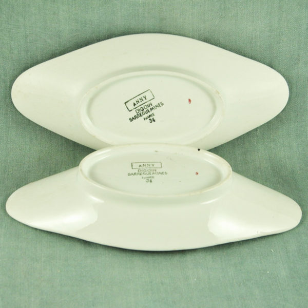2 Raviers en faïence blanche de Digoin Sarreguemines ca 1930, décor floral stylisé vert foncé et rouge, en bon état. -vendu à la pièce- 240 x 115 mm