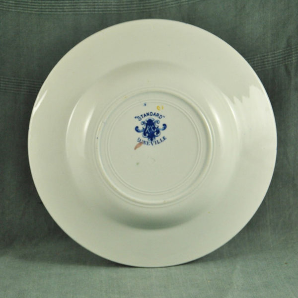 Belle assiettes creuse XIXème en faïence blanche de Lunéville (K&G), décor « Standard » frise bleu indigo rehaussée de ocre jaune, en bon état.