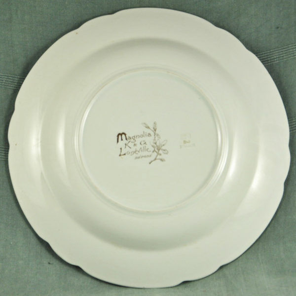 Très beau plat creux XIXème en faïence blanche chantournée de Lunéville K&G, décor des fleurs de magnolias mauves sur un fond bleuté en bon état.