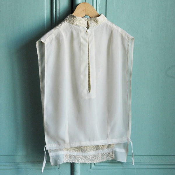 28,00 €Exquise petite robe tablier de bébé 1900 en fin linon blanc, empiècement carré et bretelles entièrement brodés de guirlandes de fleurs séparées par des entre-deux de fine dentelle: passent brodés pour y glisser un ruban en taffetas blanc; 3 petits boutons en nacre fermant le dos, en parfait état.