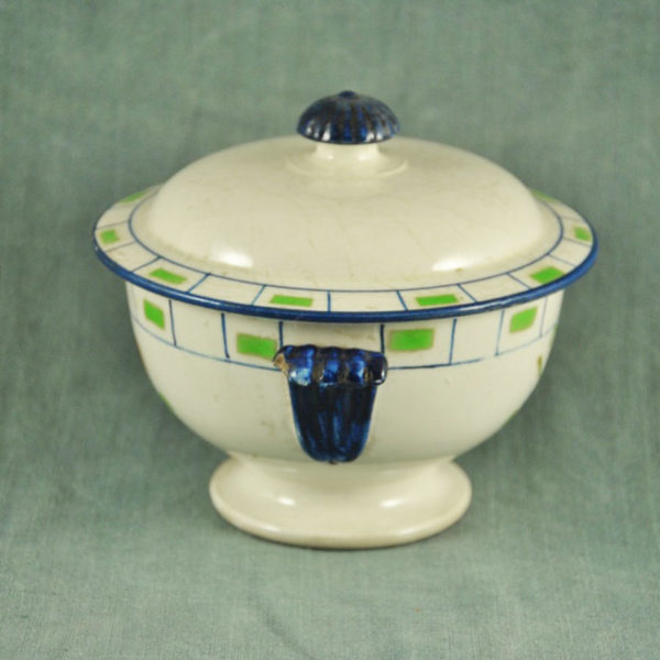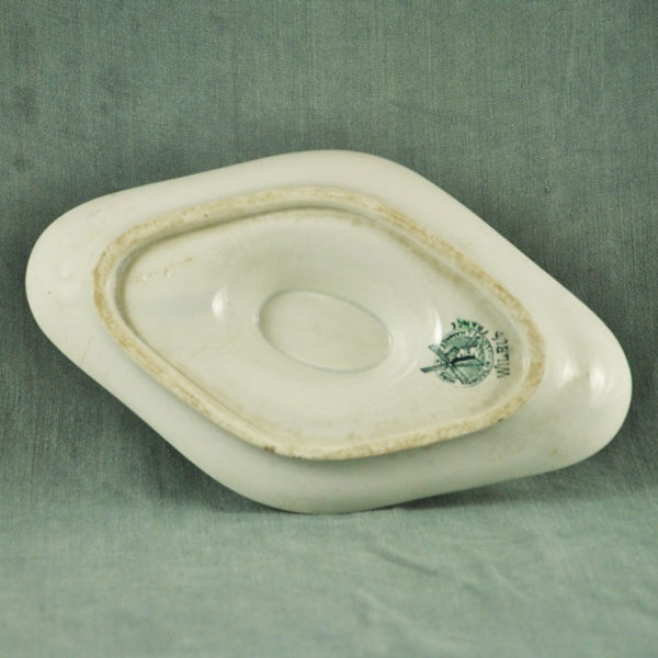 Saucière 1900 en faïence blanche , terre de fer, de Moulin des Loups et Hamage, décor « Wilbur », frise vert foncé, légèrement tachée, en bon état.