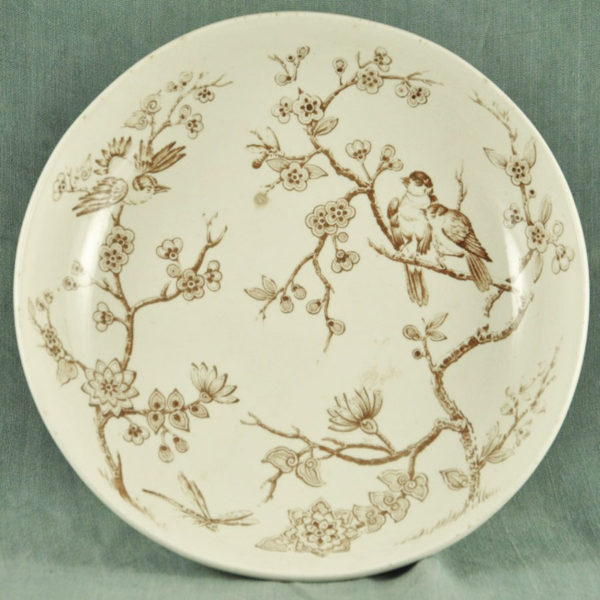 Très jolie coupe sur pied XIXème en faïence ivoire, décor sépia « Branchages », fleurs et oiseaux, « GWT&S », en bon état.