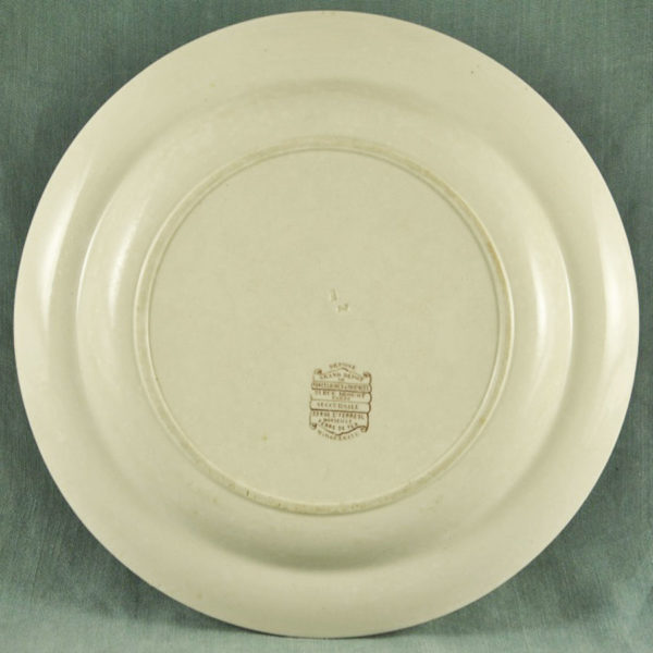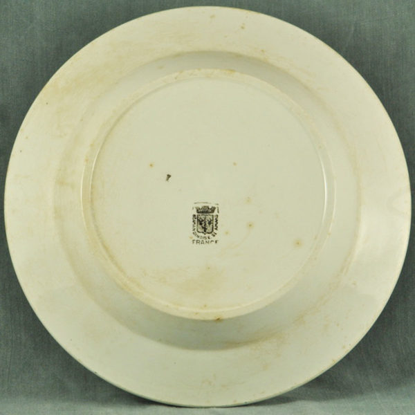 Plat creux 1900 en faïence un peu patinée de St Amand, décor: une bretonne qui tricote, petite fêlure.