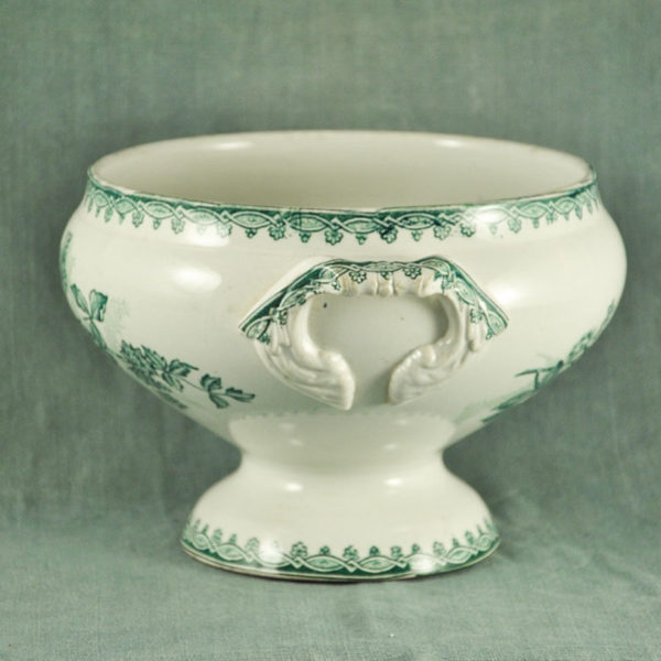 Soupière 1900 sans couvercle en faïence blanche de St Amand, décor « Margot » floral vert foncé, en bon état.