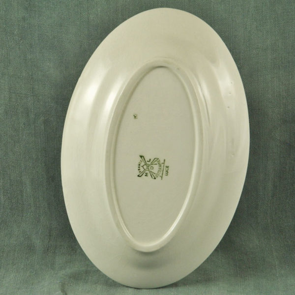 Petit plat ca 1930 en faïence blanche de Moulin des Loups, décor florale « Luce », filet rose foncé, en bon état.