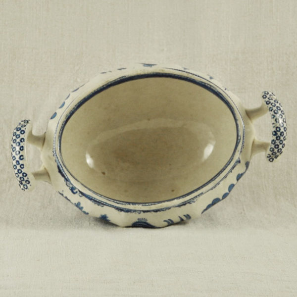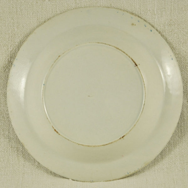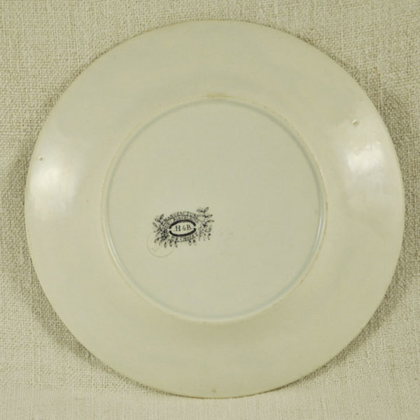 Jolie assiette ca 1860 en faïence blanche de Choisy (H&B) N°: 3 « Départ pour la pêche », frise romantique , arabesques, fleurs et oiseaux, en bon état.