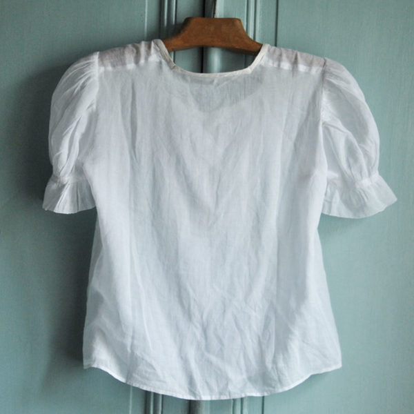 Charmant petit corsage ca 1920 en fin linon blanc, manches courtes volentées , encolure bordée d’un galon en soie, plastron plissé, petits jours et boutons perle, entièrement fait à la main.