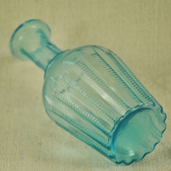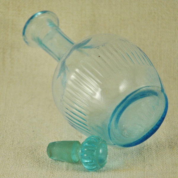 Petite carafe 1900 et son bouchon en verre moulé , nervuré bleu turquoise, en bon état.