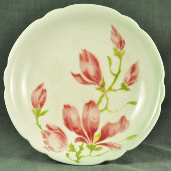 Plat sur pied XIXème chantourne en faïence blanche de Lunéville (K&G), décor « magnolia » rose et vert clair en parfait état.
