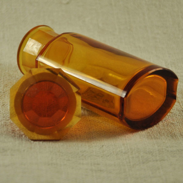 Petit flacon d’apothicaire ca 1900 en verre ambre et son bouchon à l’émeri , « oxalate de fer », en très bon état.