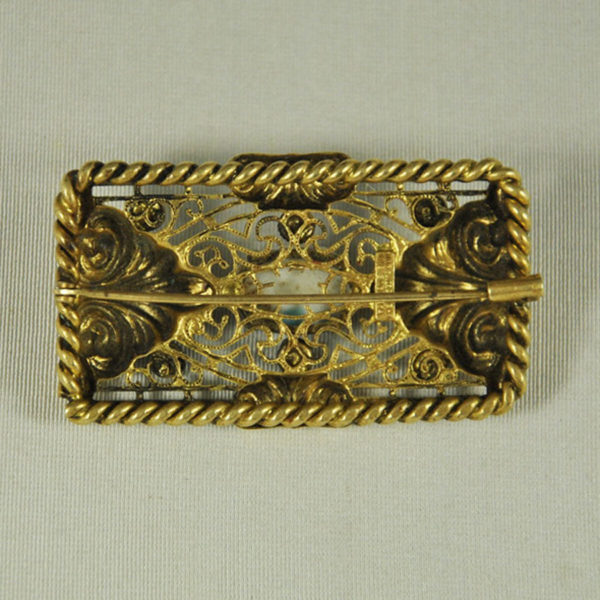 Jolie broche ca 1920 en laiton, « made in Tchécoslovaquie », pierre en pâte de verre , en bon état.